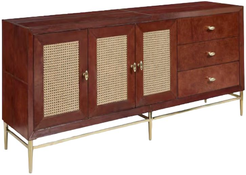 Three natural cane front doors and three suede-lined drawers rest on a brass-finished metal base that imparts an elegant airiness to this sleek yet substantial piece. The shelves behind each of the doors are removable but not adjustable -- you can place them either leather or suede side up. The soft-close drawers feature European-style hinges and powder-coated brass metal knobs. Include the Gatsby in your design curation for engaging, textural impact.