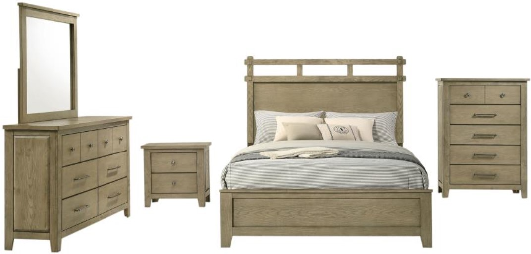 Includes: One queen bed, one nightstand, one dresser, one dresser mirror, and one chest of drawers