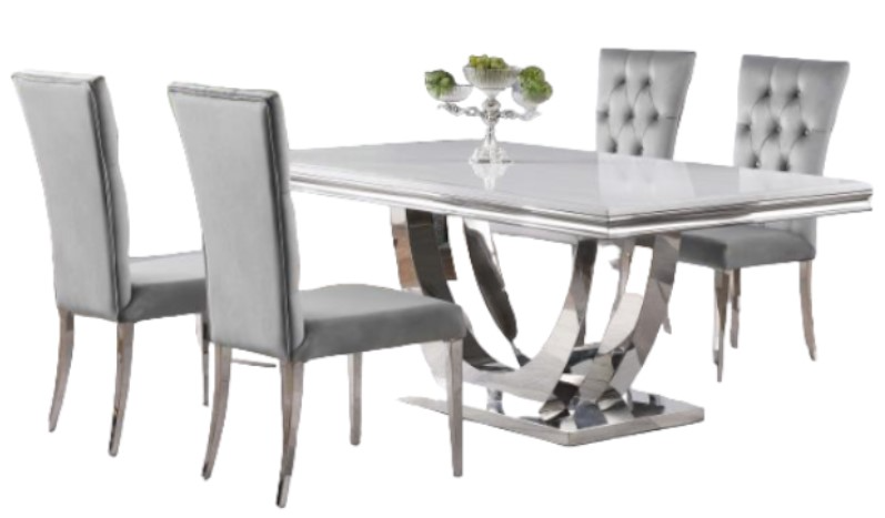 Host a party at this sophisticated modern glam dining table set, designed with a gorgeous polished chrome finish across its demilune pedestal base and four slender dining chair legs. The spacious rectangular table top presents a faux marble top and seats four comfortably and offers plenty of space for family and friends.Read More