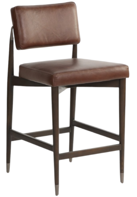 Eighties inspiration gone modern. With iron-dipped caps, tapered legs of solid oak frame this counter stool's seat and back, upholstered in brown top-grain leather. Slim wood stretchers add an airy vibe.Read More