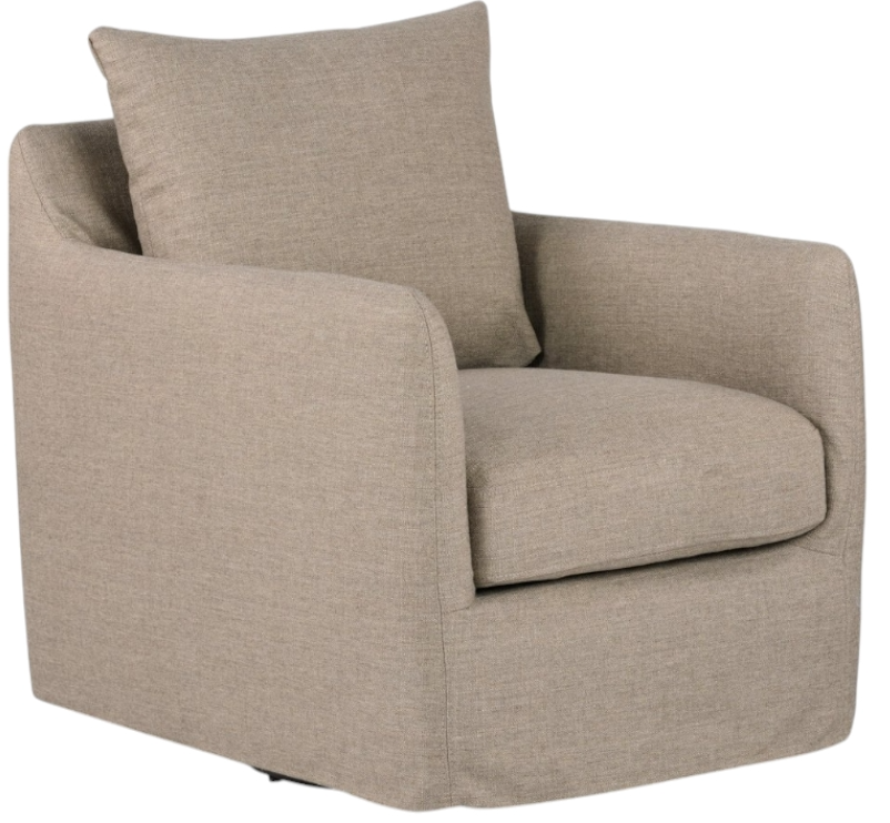 A modern take on the 360-degree swivel chair is small in scale and big in comfort. A durable taupe slipcover of high-performance fabric is created to withstand spills, stains and high traffic wear.Read More