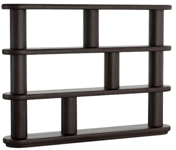 A dynamic space for books or keepsakes with a contrasting mix of cylindrical pillars and curved shelves, crafted from thick black oak. Style against the wall or as a room divider.Read More