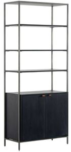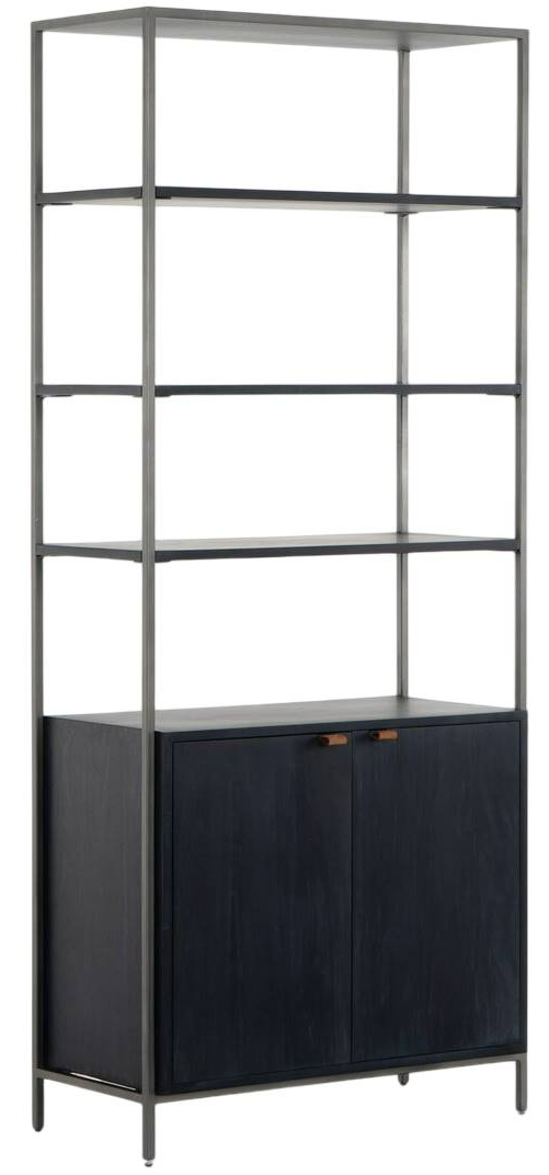 Inspired by clean midcentury design, solid black wash poplar and raw iron fuse to offer storage and display space for favorite books and treasures. Metal-secured leather pulls add a textural element of surprise. Great alone or doubled and paired with matching media console.Read More