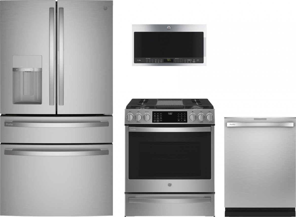 GE Profile™ 4 Piece Stainless Steel Kitchen Package with a french door refrigerator, slide in gas range, built in dishwasher and over the range microwaveRead More