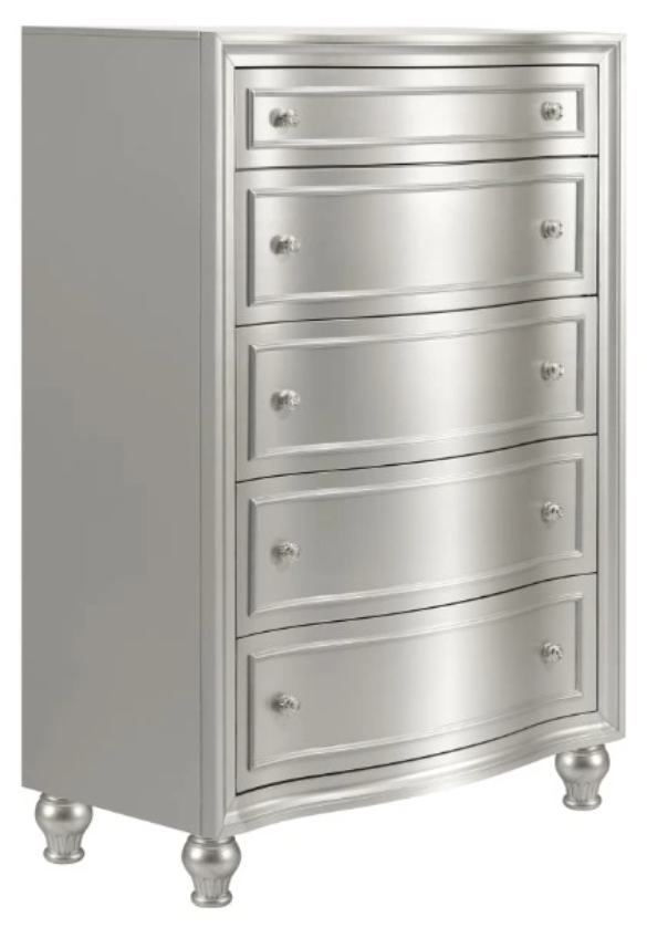 Introducing the Reflection chest in silver, meticulously crafted from solid pine and high-quality manufactured wood to ensure enduring strength and durability. Its glamorous matte silver finish exudes sophistication, reflecting the mirrored panels and silver drawer pulls of the 5-drawer chest, adding an elegant touch to any bedroom decor.Read More