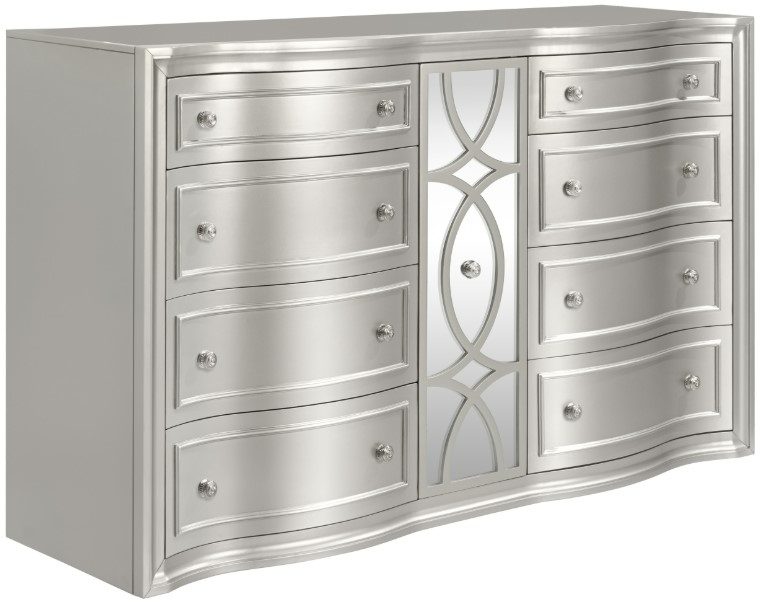Glamorous Matte Silver Finish: The glimmering sheen adds an elegant touch and reflects the mirrored panel and silver drawer pulls of the 8 drawer dresser